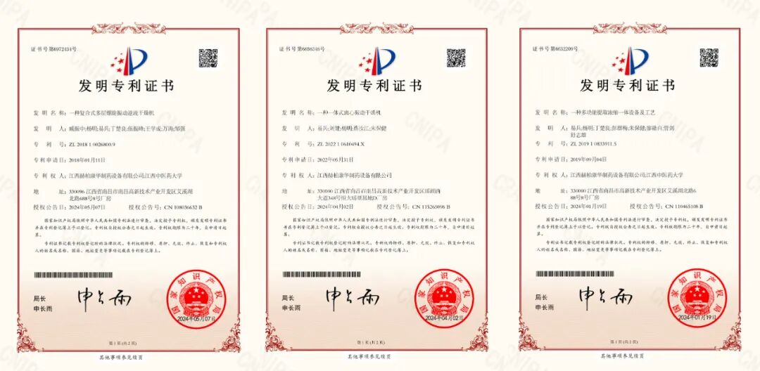 2024年至今,赫柏康華一種復(fù)合式多層螺旋振動(dòng)逆流干燥機(jī)、一種一體式離心振動(dòng)干燥機(jī)、一種多功能提取濃縮一體設(shè)備及工藝三項(xiàng)發(fā)明專(zhuān)利獲國(guó)家知識(shí)產(chǎn)權(quán)局授權(quán)。